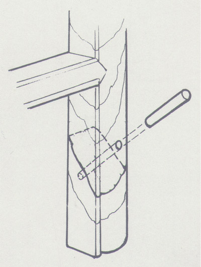 破頭楔(圖)通常是在透榫端部的靠近外側的適當位置,預先鋸開楔口,待榫入卯后,再備入楔子,使榫頭體積加大。此楔口也可以臨備楔前用鑿子刻開。常用在攢邊的桌面、椅面、床面的四角等結構部位的透榫上。